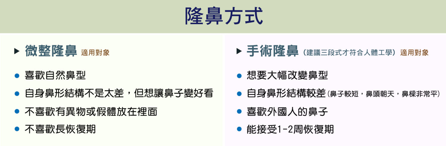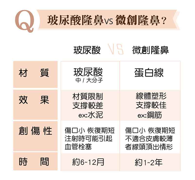 隆鼻最常見的就是使用玻尿酸或晶亮瓷液態填充,玻尿酸是最安全的填充物,但約6-12個月就會被自體吸收代謝,對於簡單的鼻根高度隆起有一定的效果,但長期使用液態填充,久了皮膚會鬆弛,也會導致山根處愈來寬愈來愈胖。