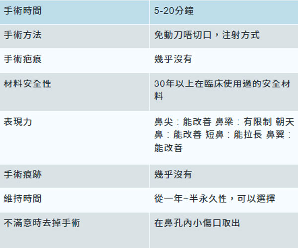 一般的微整注射是無法改變形狀,但免動刀微創隆鼻術可提高鼻頭且可延長鼻頭的效果。手術簡單快速,也不會有手術需要恢復期的傷口。