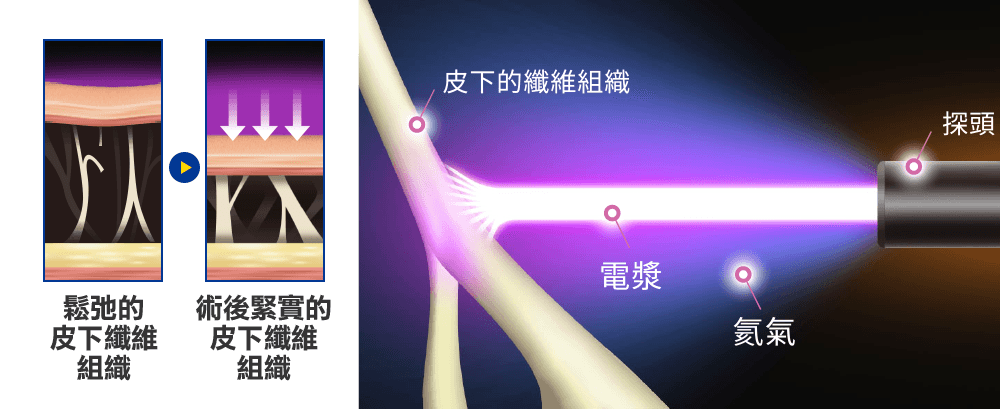超能電漿是新一代的縮皮手術,透過微創的切口,將氦氣電漿能量傳送到治療部位,1秒內瞬間提升高溫,讓膠原蛋白急速收縮、增生,使表皮與組織達到超能緊緻的功效。