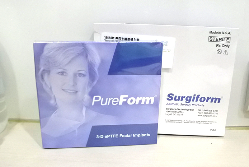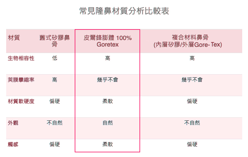 為 100% Goretex 材質,為美國製造,是為醫療使用材料,具有高度生物相容性、低排斥反應。其特殊微孔結構設計,微孔大小約20~40um,能讓新生組織長入,固定性佳,不易位移。Goretex 皮爾鋒 隆鼻填充物是政府合格認可的材質可以放心使用(衛署醫器輸字第024916號)