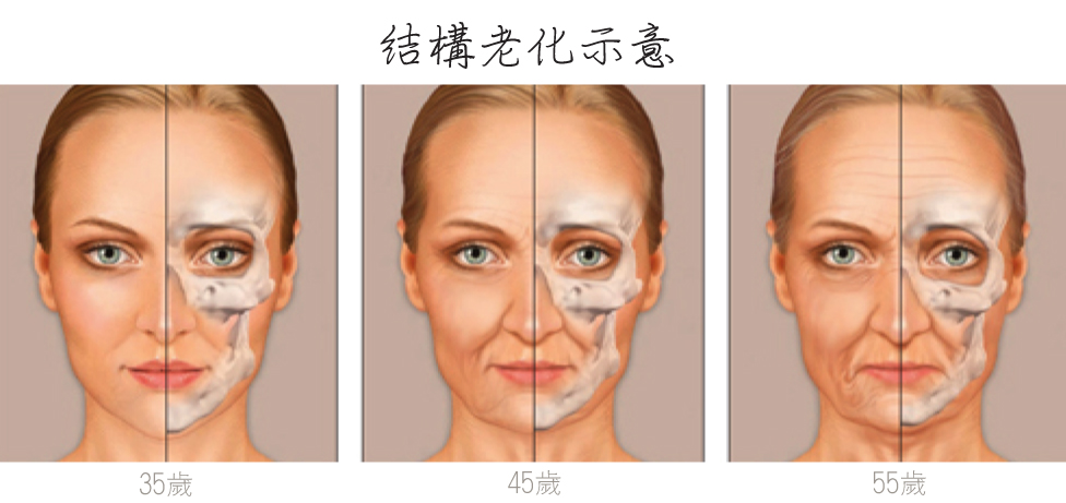 老化:通常大家第一個聯想到的就是皺紋,而老化也伴隨其他症狀:凹陷,下垂,組織脂肪移位,骨架流失…等。