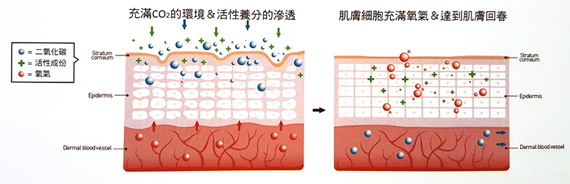 高濃度CO2會讓肌膚環境PH值下降,促使血紅蛋白與氧氣親和力下降,故氧氣便由肌底釋放緻肌膚細胞間。