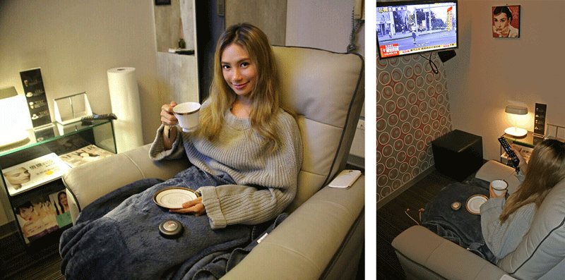 包廂內的貼心小品應有盡有,除了電視雜誌可供觀看外,專用的置物櫃讓您置放貴重物品,另外也提供免費的香濃咖啡及小點…等。