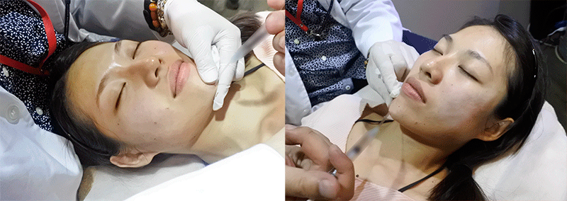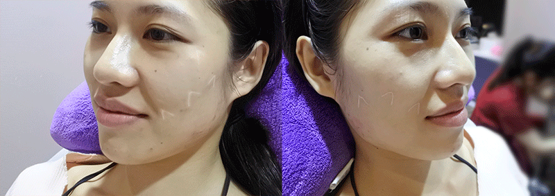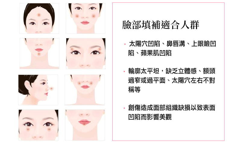 使用玻尿酸注射的治療方法,將凹陷的部位填補,不僅使臉部肌膚線條柔和、好氣色,笑起來的時候更會出現飽滿可愛的蘋果肌。