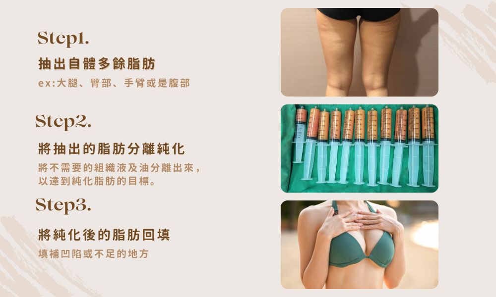自體脂肪隆乳(豐胸)是透過微創抽脂技術,將體內多餘脂肪不經破壞的取來填補凹陷或不足的地方。