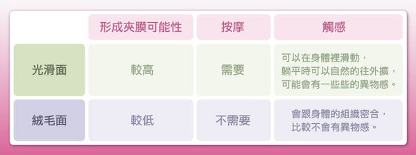 而阿姬師會捨棄光滑面矽膠,是因為這種材質的填充物行成夾膜可能性較高,所以需要術後按摩,放置胸部之內還有可能在身體裡滑動,可能會造成一些異物感; 而絨毛面矽膠因為會跟身體的組織密合,所以比較不會發生夾膜,也比較不會有異物感。