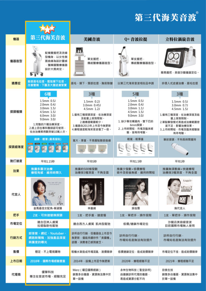 | Ultraformer III | 韓國HIFU技術 | 多層深度 | 多層次探頭配置,速度快,治療舒適 |