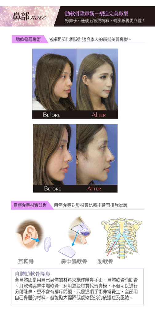 從耳軟骨、鼻中隔到肋軟骨,肋軟骨是公認最佳隆鼻整形素材,減少自體吸收、排斥或感染等問題。臨床經驗指出,利用肋軟骨隆鼻整形做的鼻子,健康安全且自然永久,鼻部軟組織會自然包覆這些自體軟骨,術後幾乎看不出動刀痕跡,也無須擔心移植物突出於體外,且鼻子線條會隨時間而愈趨自然。