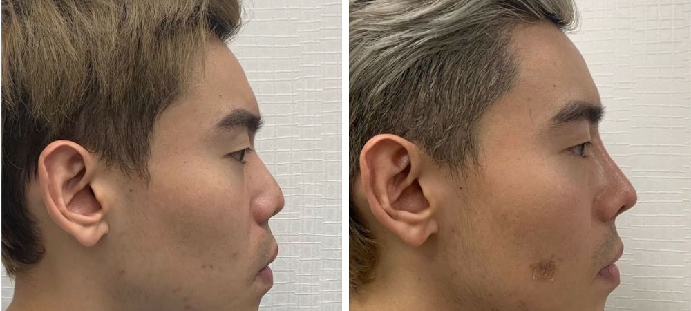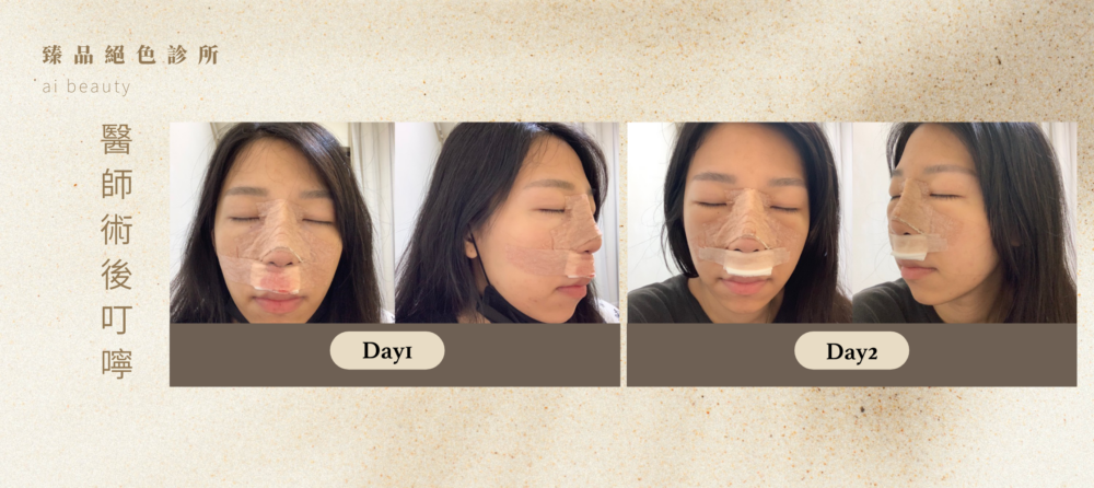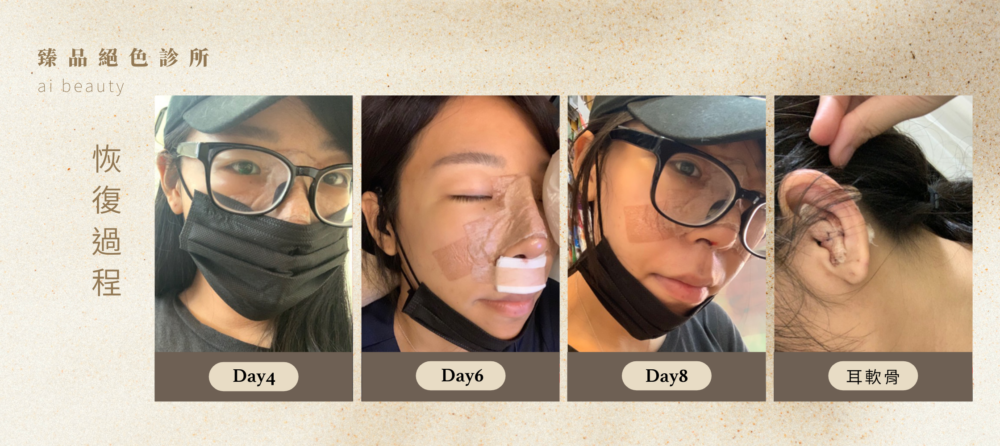 孫萬烜醫師:「手術後圖片中可以看到用膠布貼緊,此固定方式讓傷口與植入物,以及雕刻過的自體組織交接處,我們外側再加上鼻背板與之固定貼合保護,術後7-10天視各體恢復狀況不同,經評估後陸續將固定板與縫線拆除,術後恢復過程中一般日常生活影響不大,若發生微腫、紅或微熱使用冰敷消腫為基本日常照顧。」
