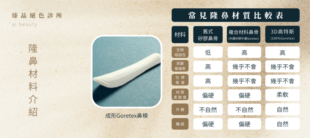孫萬烜醫師:「案例使用的植入物為Goretex,此材質特性本身有許多微小孔洞,術後自體組織可以生長得進去,那在外觀上看起來會更順型,降低術後發炎感染、或是透亮、發紅的疑慮,目前在材料的選擇上植入物Goretex對於自體吸收的速度較慢另外耳軟骨自體天生的曲線相似於鼻頭或鼻侧的形狀,若需要鼻頭延長或挺度修型時,經評估可選擇使用鼻中膈以片狀的方式取出,依照整體鼻子往上或往前的比例再做精雕。」