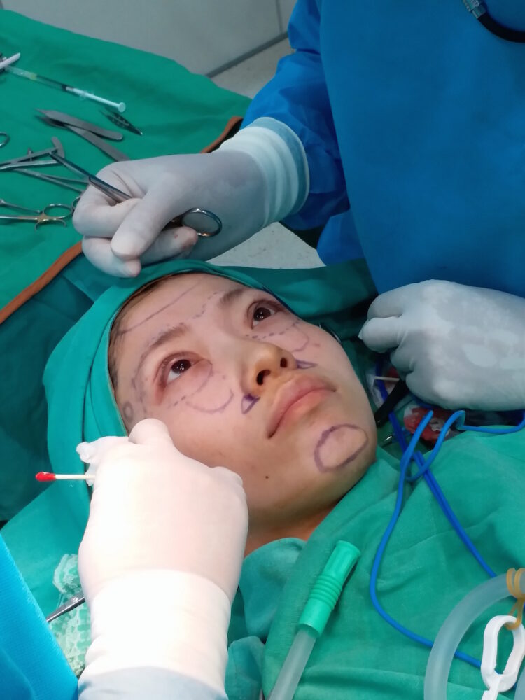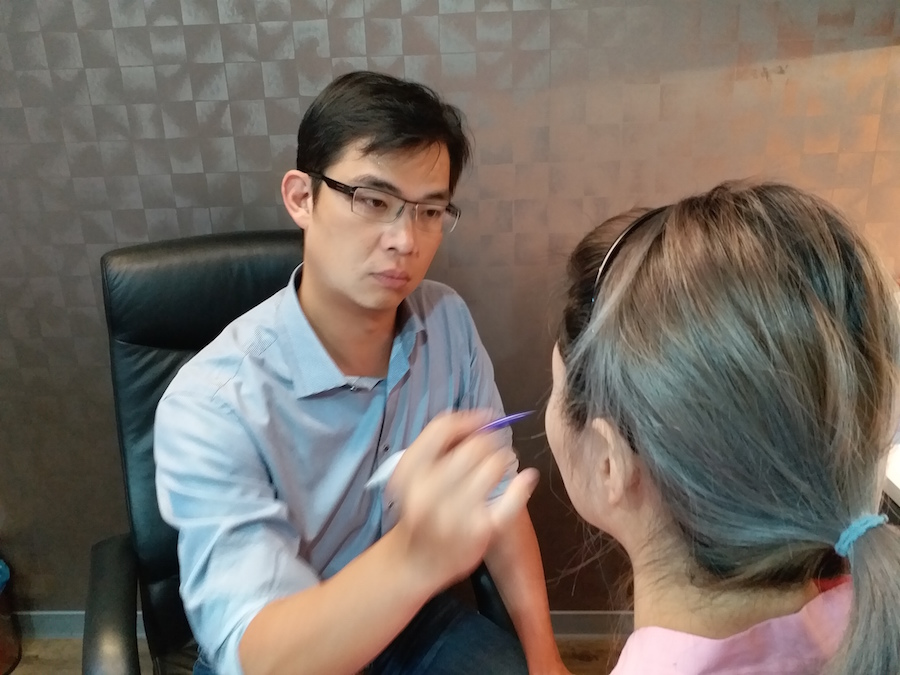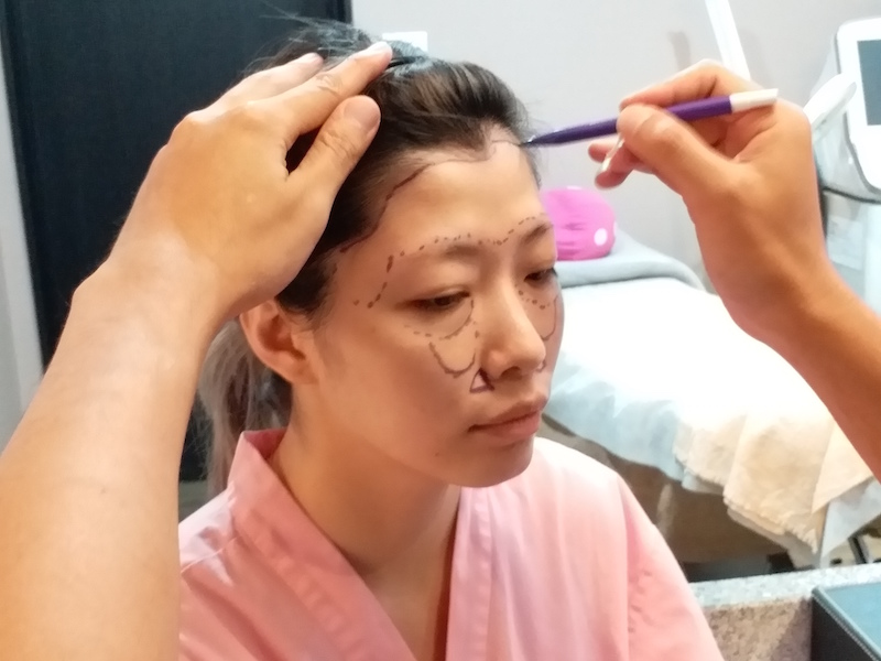謝醫師先在我臉上做記號,跟我溝通要填補脂肪的位置以及線條。