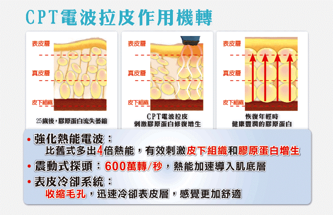 CPT電波拉皮原理:電波與微波都屬於光譜中非游離幅射光線的一段,不同的是,電波的頻率範圍較低﹙3kHz(kilo hertz)~ 300MHz(mega hertz)﹚,而微波的頻率範圍較高﹙300MHz(mega hertz)~300GHz(giga hertz)﹚,兩者相同點在於它們僅能將組織加熱,大家耳熟能詳的微波爐,便是利用此原理,將食物加熱。電波可以加熱組織,而且是深層的組織,因此運用電波的原理,選擇 6MHz 頻率,在電腦系統嚴密的監視下,再加上表皮冷卻系統的幫助,可以精確的加熱全層的真皮組織,甚至於皮下脂肪組織,產生雙重的皮膚反應:立即性的組織收縮,與長期的膠原蛋白新生,達到媲美拉皮手術的除皺作用,與相當於磨皮的除痘疤作用,一次的治療,可以有長達六個月的改善,與持續2年的效果。